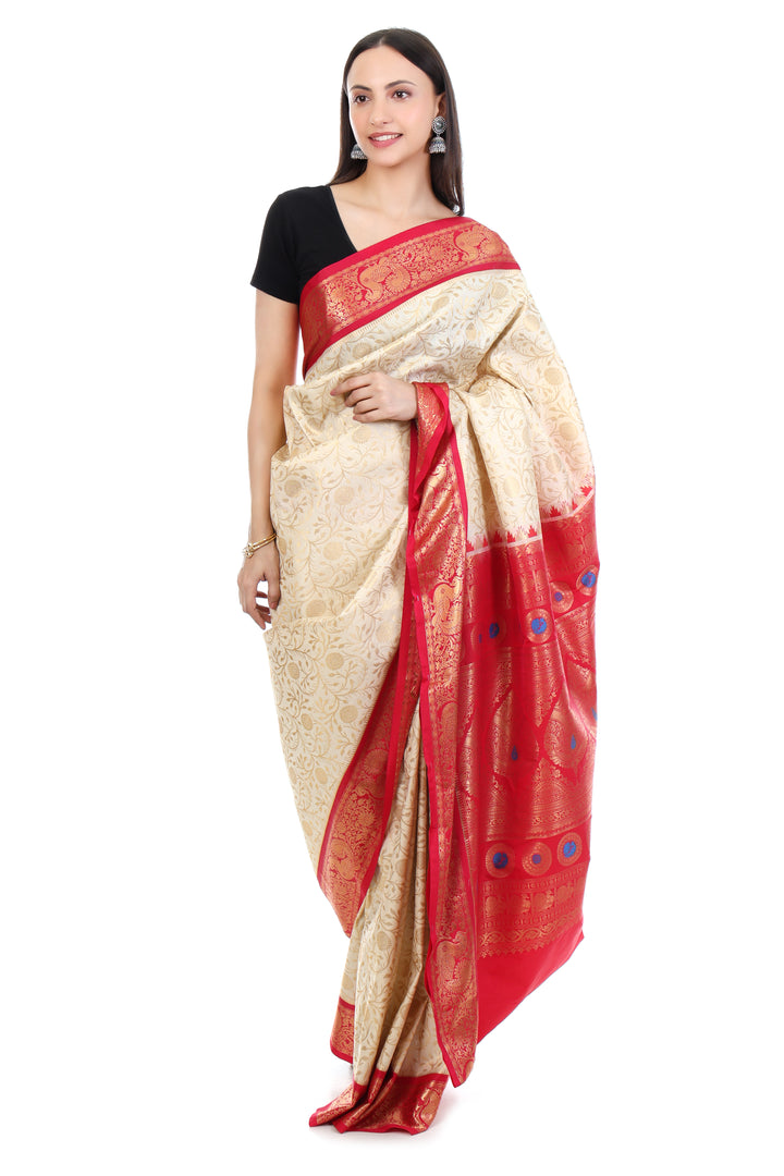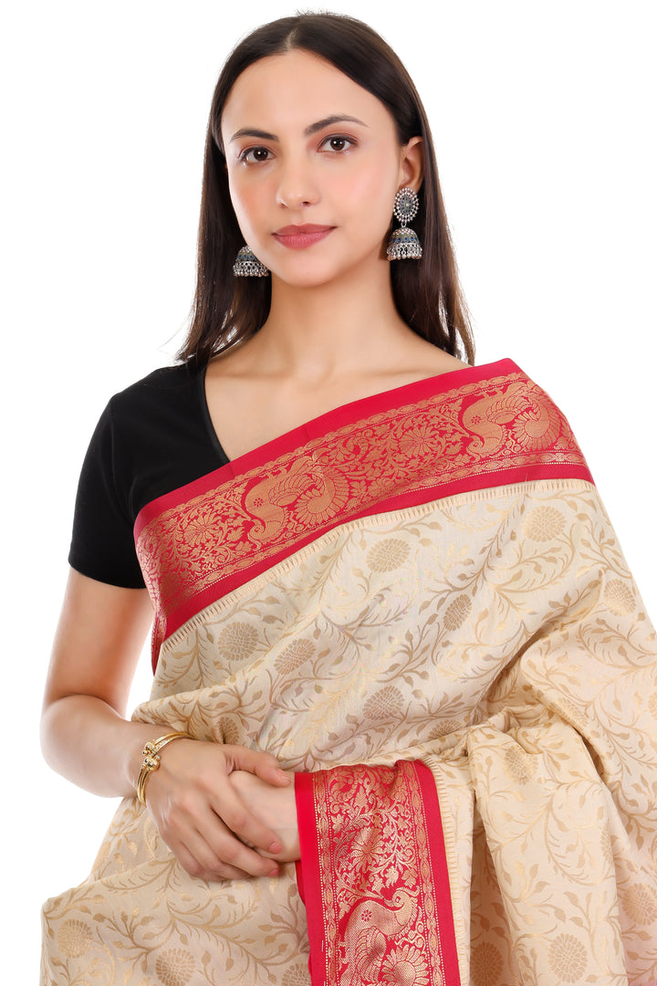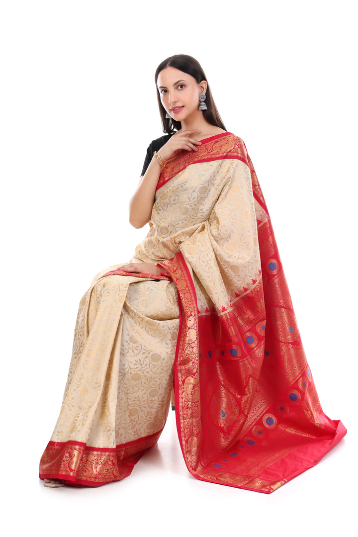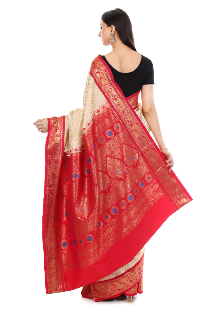 Comes with a matching or contrast blouse piece, adorned with zari borders for a complete look.