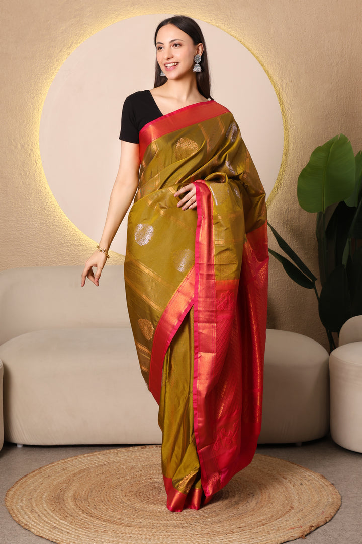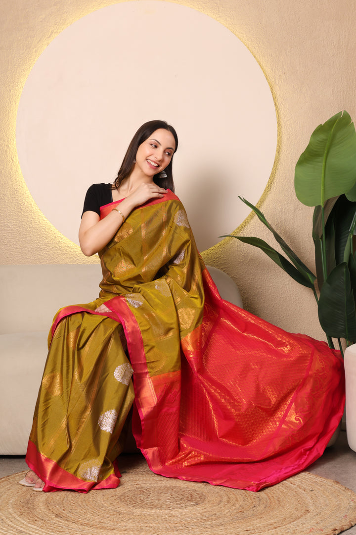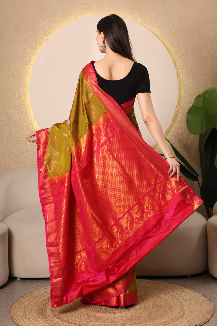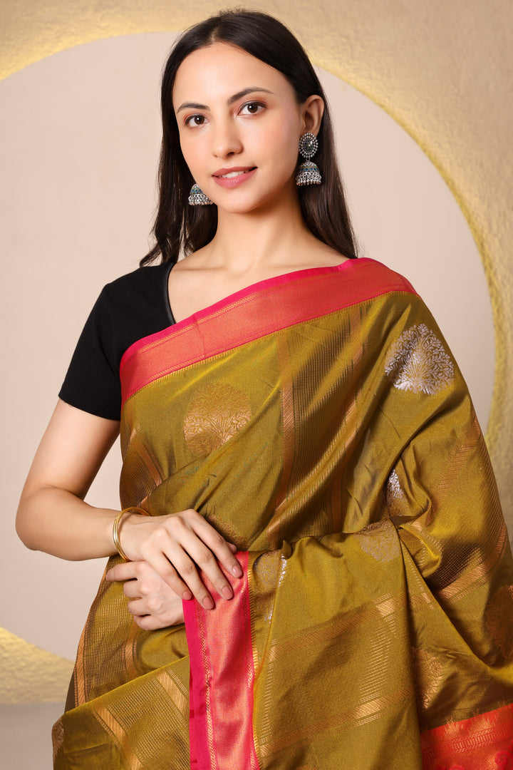 Kanchi Semi silk - Mehandi and Pink