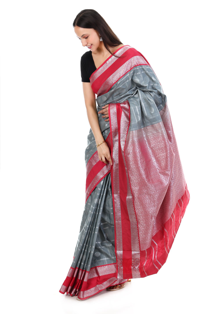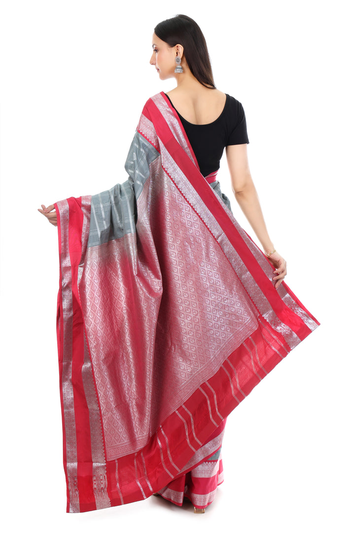 Comes with a matching or contrast blouse piece, adorned with zari borders for a complete look.