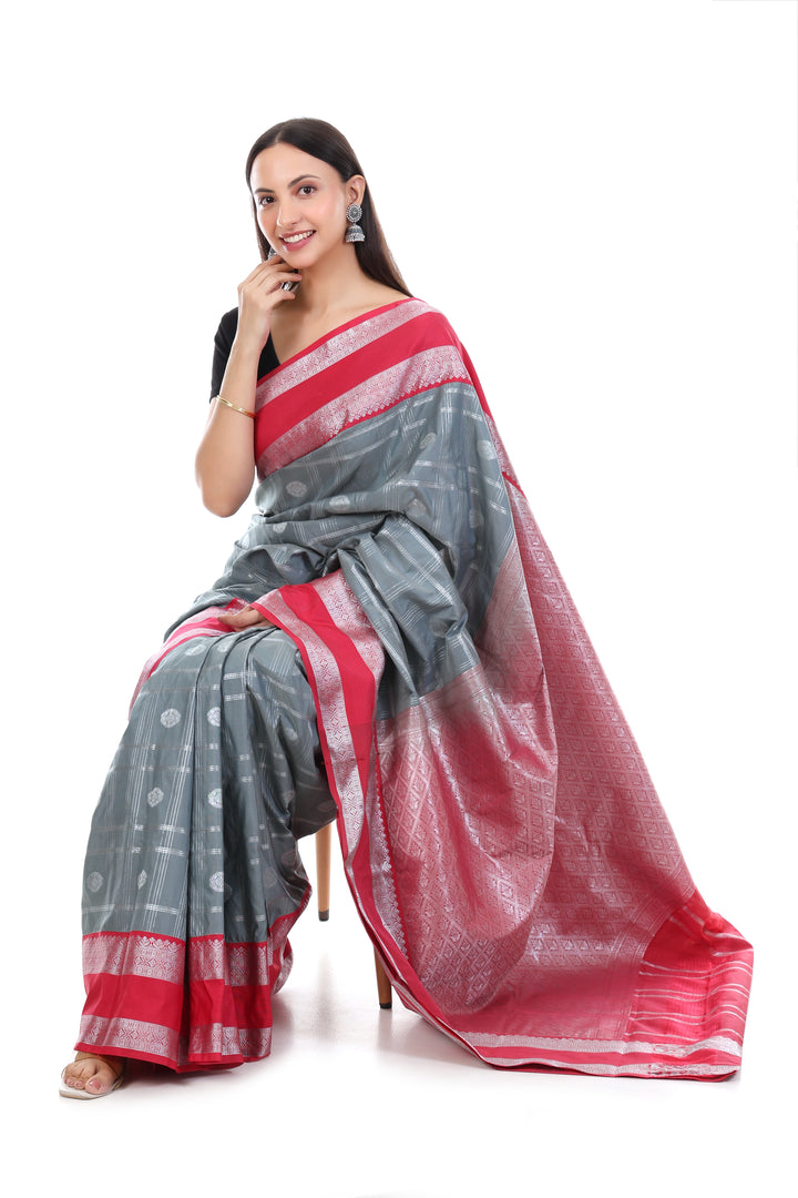 Kanchi Semi Silk Saree embodies timeless elegance and cultural heritage. The soft body, symbolizing purity and grace, is beautifully complemented by a rich border and pallu, reflecting prosperity and tradition. This saree is perfect for weddings, temple rituals, and grand celebrations.
