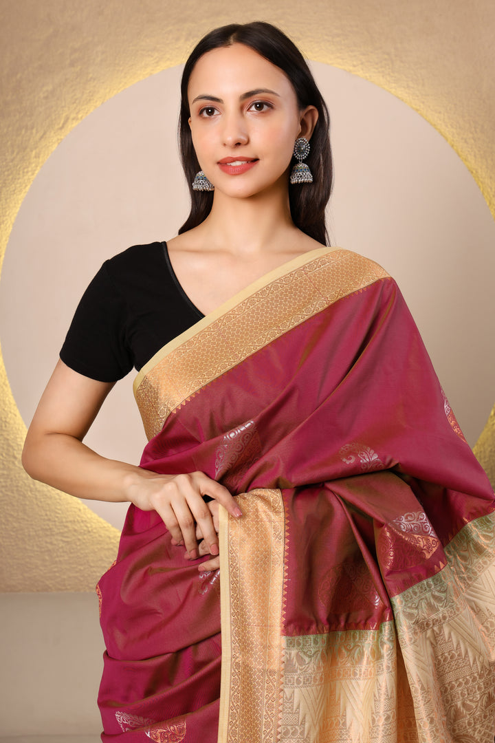 Kanchi Semi Silk Saree embodies timeless elegance and cultural heritage. The soft body, symbolizing purity and grace, is beautifully complemented by a rich border and pallu, reflecting prosperity and tradition. This saree is perfect for weddings, temple rituals, and grand celebrations.