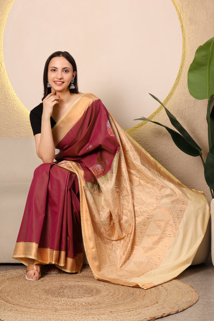 Comes with a matching or contrast blouse piece, adorned with zari borders for a complete look.